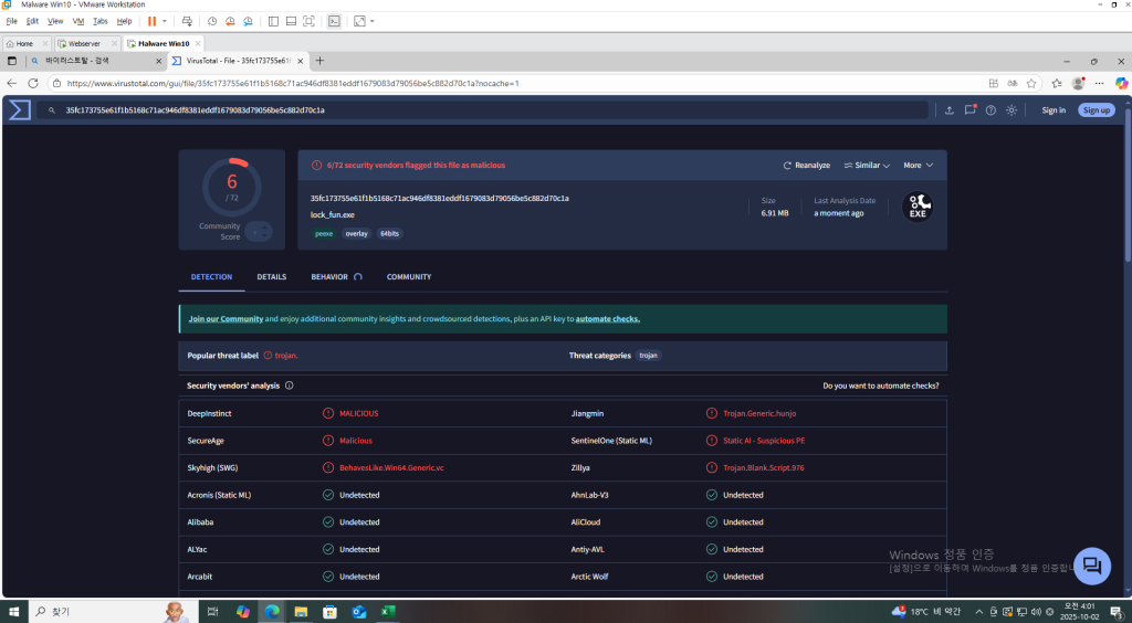 해당 EXE를 바이러스토탈에 검색 결과 백신 72개 중 6개에 탐지된 것을 확인할 수 있다.